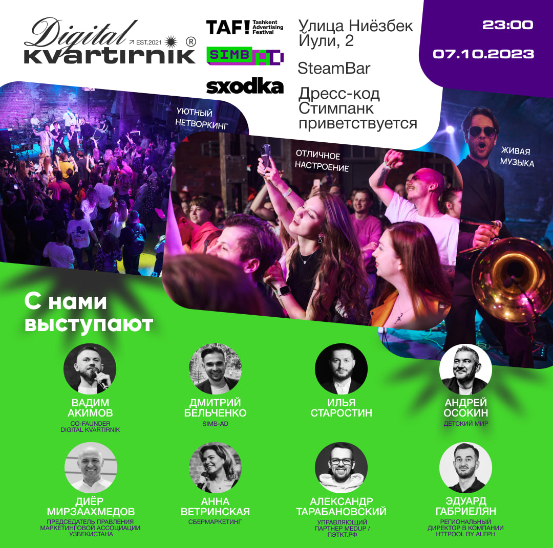 Digital-квартирник — неформальное мероприятие для представителей рекламного рынка теперь в Узбекистане! Впервые эксперты рекламы будут не рассказывать кейсы, а петь! Никаких кейсов, никаких спикеров, никаких презентаций.