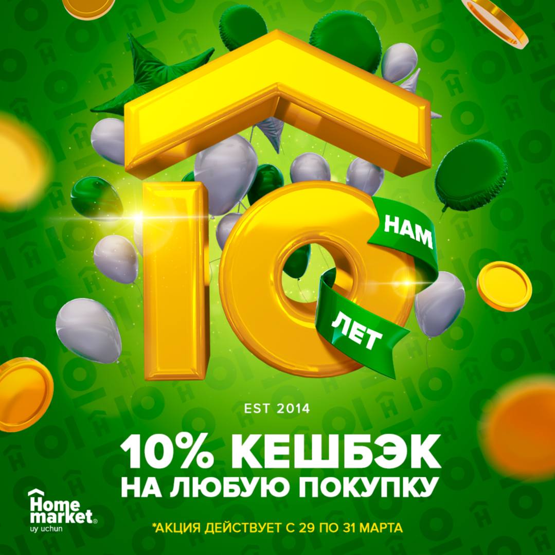 Эксклюзивное предложение от Home Market в честь 10-летия — получите 10% кешбэком на ваши покупки!