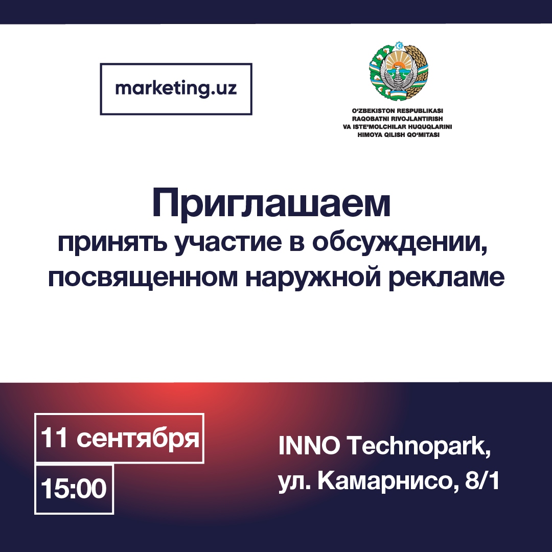 Комитет по развитию конкуренции и защите прав потребителей Республики Узбекистан в рамках проекта «Мы вас слышим!» 11 сентября в 15:00 в INNO Technopark (ул. Камарнисо, 8/1) проводит «круглый стол» на тему «Новые этапы развития рекламного рынка». В ходе обсуждения будет разъяснено содержание Постановления Кабинета Министров № 428 от 31 августа 2023 года «О мерах по дальнейшему совершенствованию отношений в сфере внешней рекламы и распространения социальной информации».