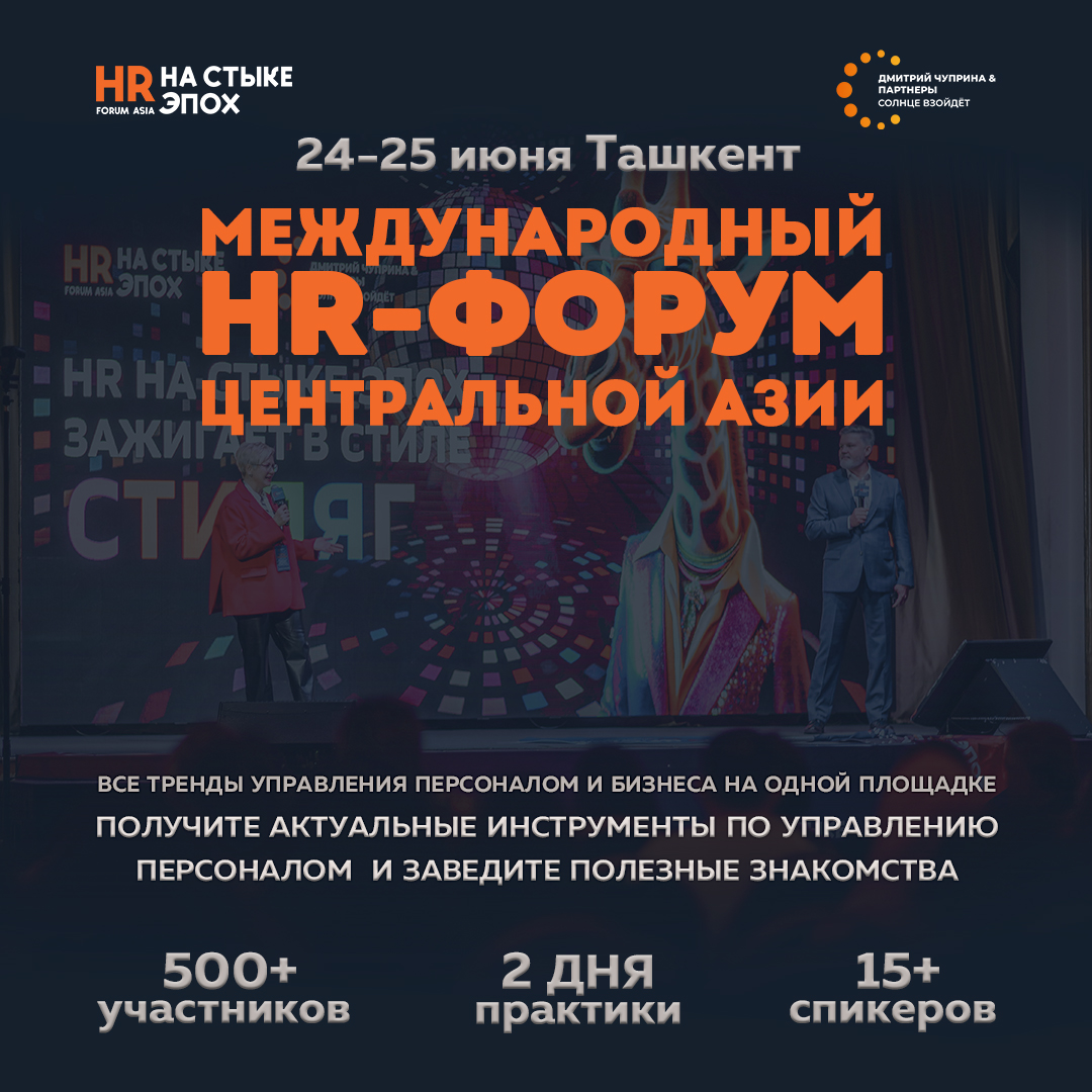 Приглашаем вас принять участие в ежегодном МЕЖДУНАРОДНОМ HR-ФОРУМЕ ЦЕНТРАЛЬНОЙ АЗИИ "HR НА СТЫКЕ ЭПОХ" - главное HR и бизнес событии года в Кыргызстане, которое состоится 24-25 июня в Ташкенте, организуемый Международной консалтинговой компанией «Дмитрий Чуприна & Партнеры». Форум проводится 3 год подряд и по праву считается главной HR-площадкой региона, где обсуждаются реальные вызовы, обмениваются практиками и рождаются решения, способные менять бизнес. Для этого на одной сцене соберутся действующие HR-директоры крупных компаний Узбекистана и международные эксперты, чтобы обсудить и представить новые эффективные инструменты в области управления персоналом.
