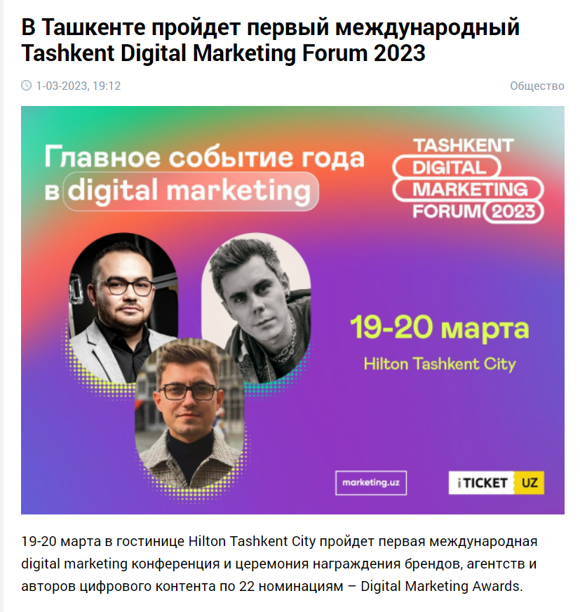 19-20 марта в гостинице Hilton Tashkent City пройдет первая международная digital marketing конференция и церемония награждения брендов, агентств и авторов цифрового контента по 22 номинациям – Digital Marketing Awards.