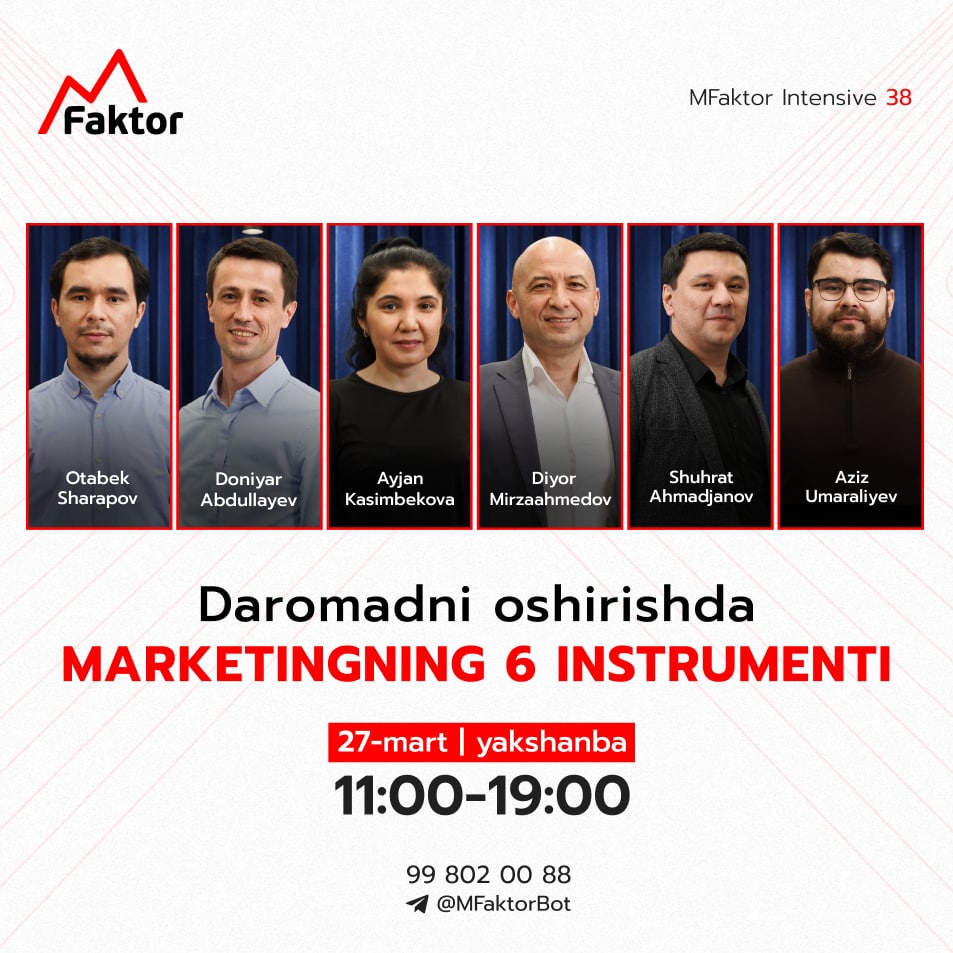 27-mart "Daromadni oshirishda marketingning 6 instrumenti" mavzusida yurtimizning oldi marketologlari bilan intensive tadbirimiz bo'lib o'tadi.