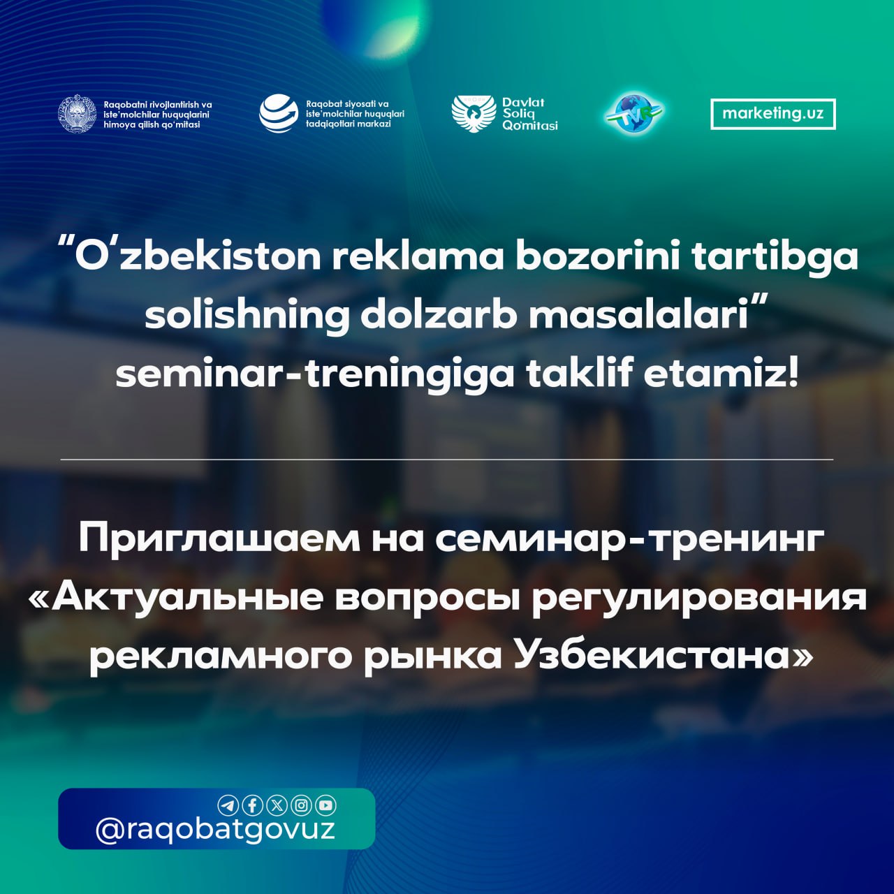 O‘zbekiston Respublikasi Raqobatni rivojlantirish va iste’molchilar huquqlarini himoya qilish qo‘mitasi huzuridagi Raqobat siyosati va iste’molchilar huquqlari tadqiqotlari markazi tashabbusi bilan sohaga doir davlat idoralari ekspertlari ishtirokida, “O‘zbekiston reklama bozorini tartibga solishning dolzarb masalalari” seminar-treningini o‘tkazadi.