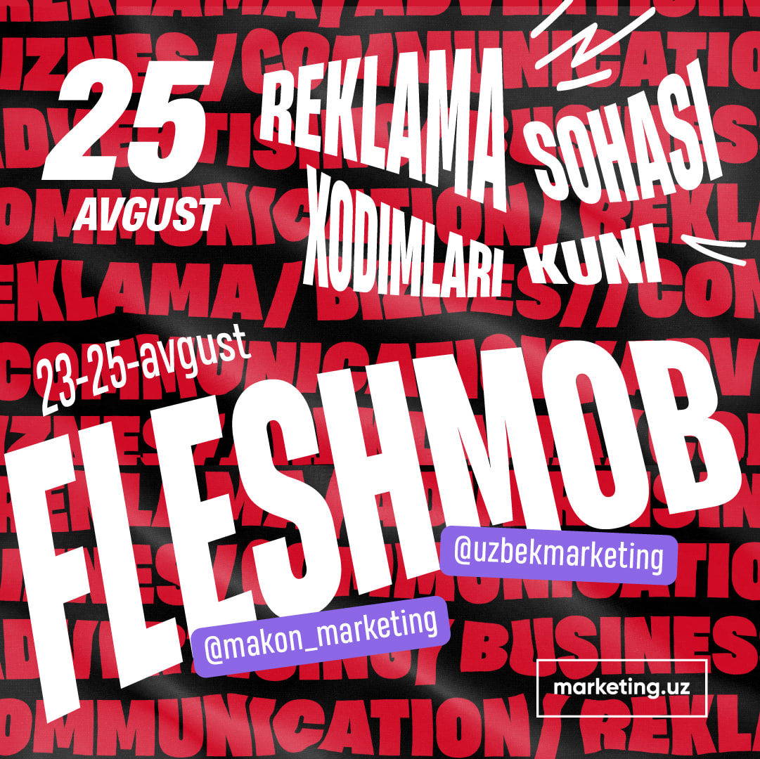 Bayram munosabati bilan, reklama yaratish va tarqatishga aloqador bo‘lgan, yaxshi reklamani yoqtiradigan barchaga 23-avgustdan 25-avgustga qadar bayram fleshmobida qatnashishni taklif etamiz!